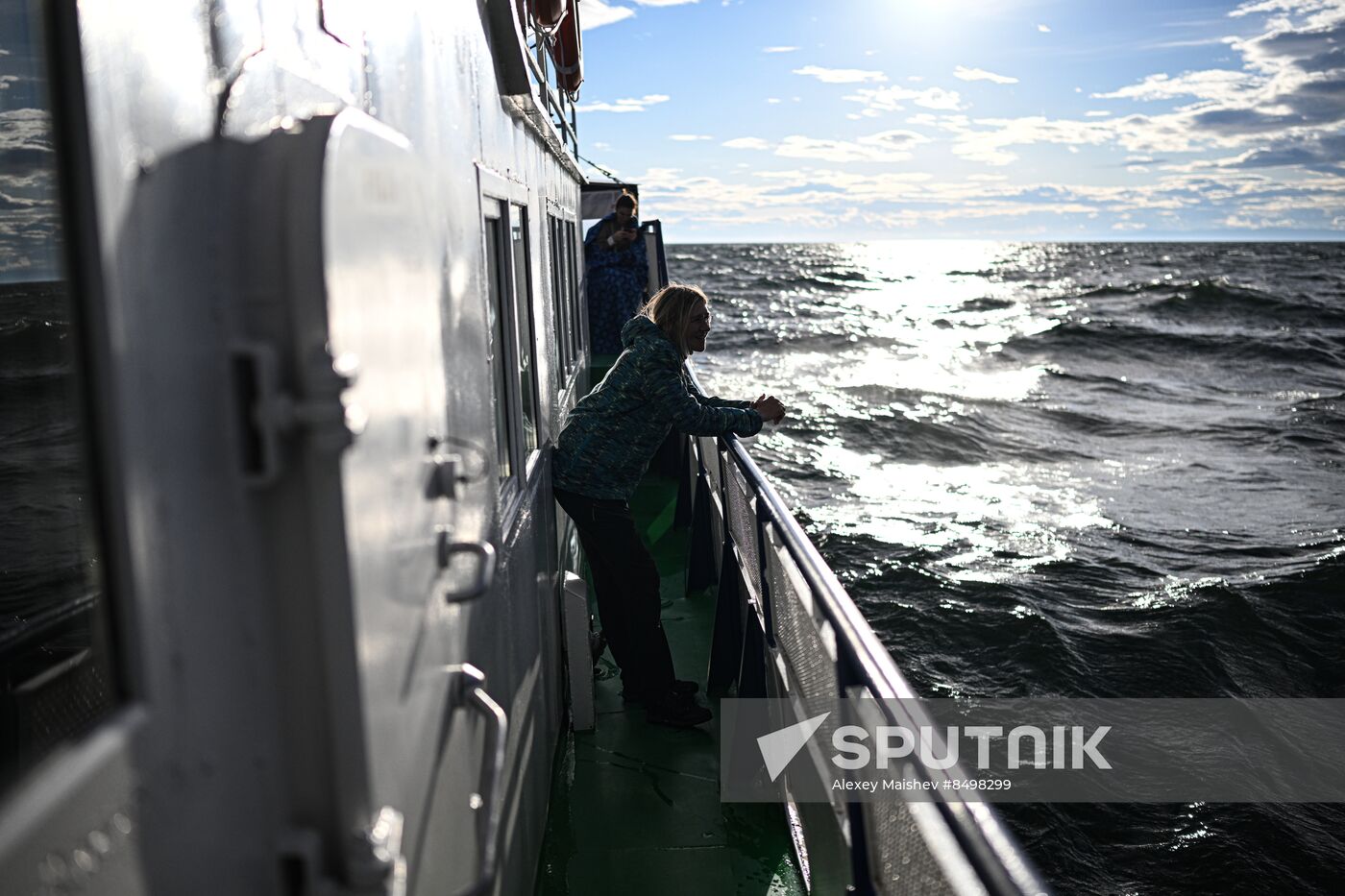 A woman is seen on board a pleasure boat which sails on Lake Baikal near the settlement of Turka, the Republic of Buryatia, Russia.