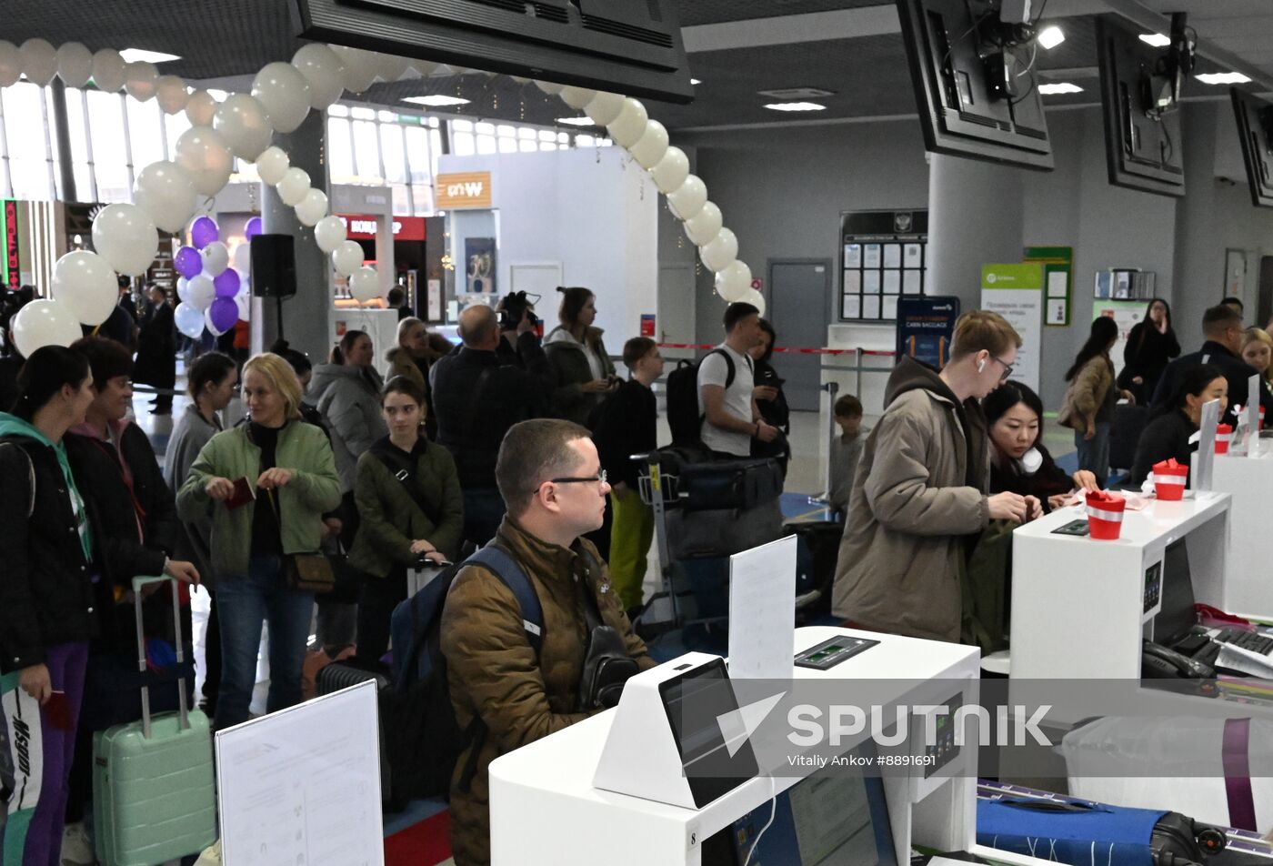 Passengers check-in for their flight to Beijing in China, at Vladivostok International Airport near Artyom, Primorye Territory, Russia. Starting March 31, Air China, the flagship airline of China, launches a new direct route from Vladivostok to Beijing Capital International Airport (PEK).
