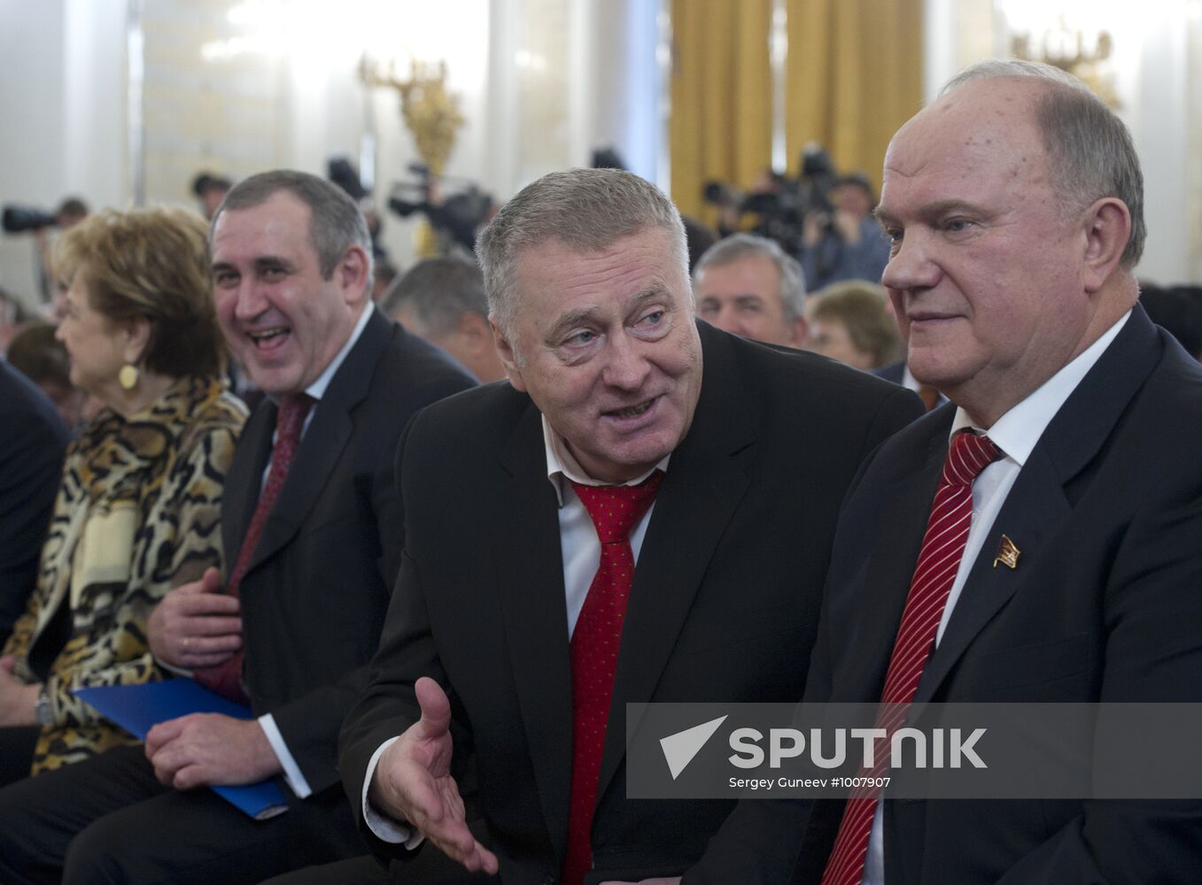 From right: leaders Gennady Zyuganov of the Communist Party of the Russian Federation and Vladimir Zhirinovsky of the Liberal Democratic Party seen at the Kremlin's St.George Hall to become the venue of President Dmitry Medvedev's annual address to the Federal Assembly.