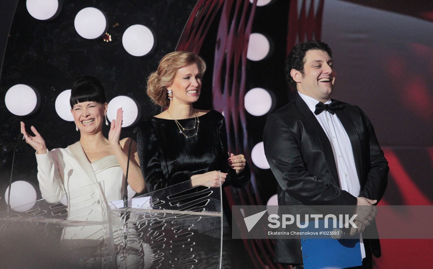 From left: Actors Nonna Grishayeva, Olesya Sudzilovskaya, and Mikhail Politseimako, at the Golden Eagle award ceremony, Moscow.