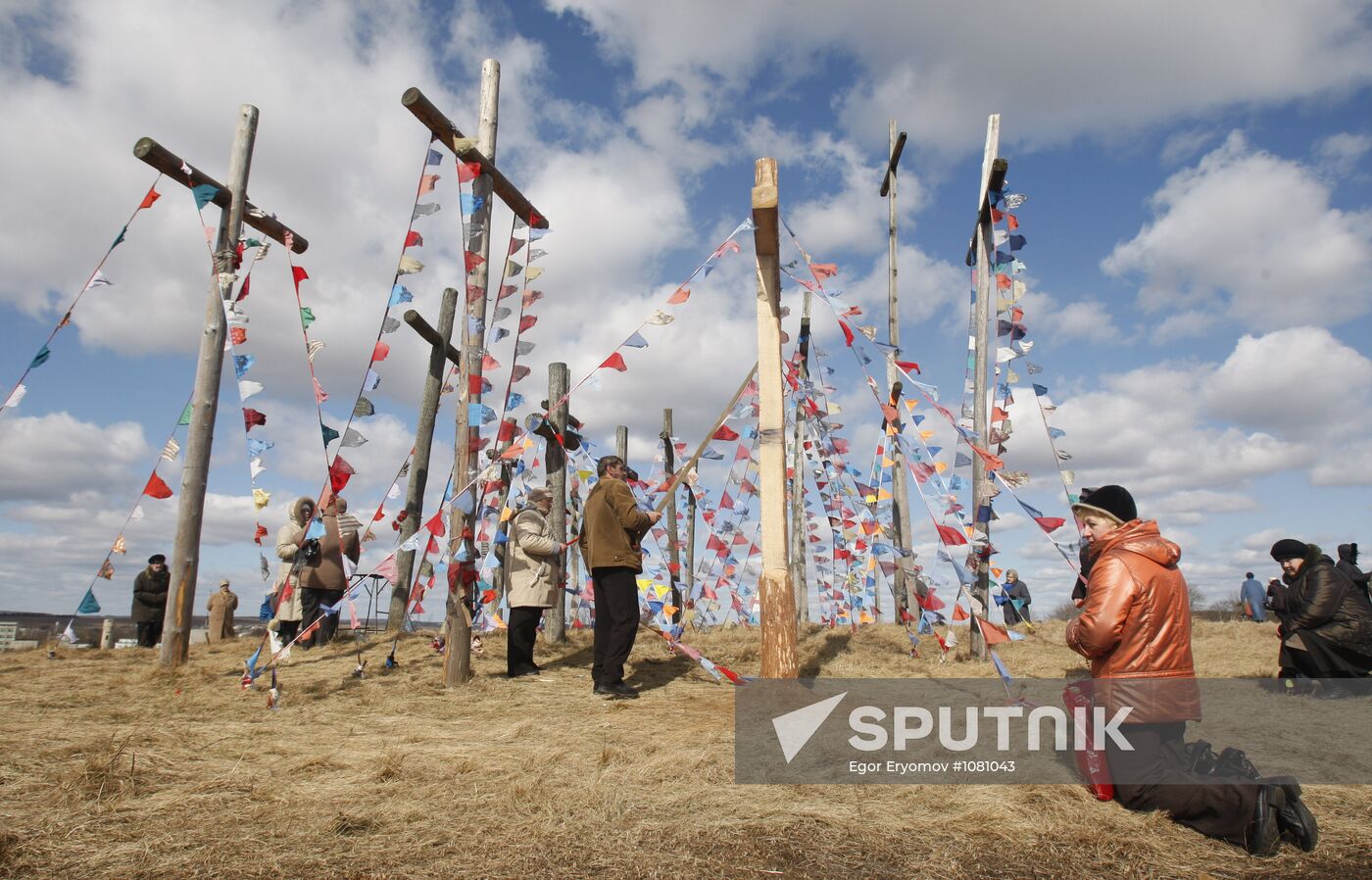 Believers pray after the procession during Catholic Palm Sunday observances in the village of Oshmyani in the Grodno region of Belarus.