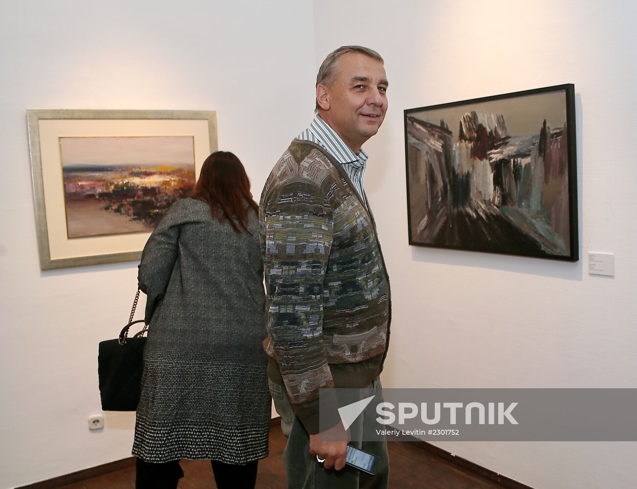 Magiс Box company general director Oleg Leshchuk is seen near the painting "The Grey Landscape" at the private viewing of the exhibition of paintings by Igor Vulokh at the Moscow Museum of Modern Art.