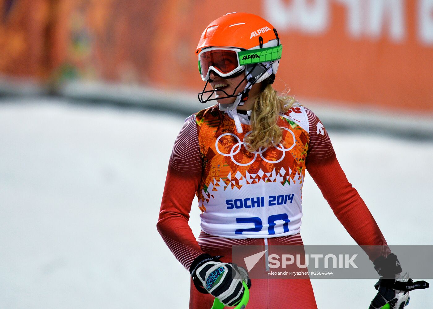 Denise Feierabend (Switzerland) at the finish of the second run in the women’s slalom at the XXII Olympic Winter Games in Sochi.
