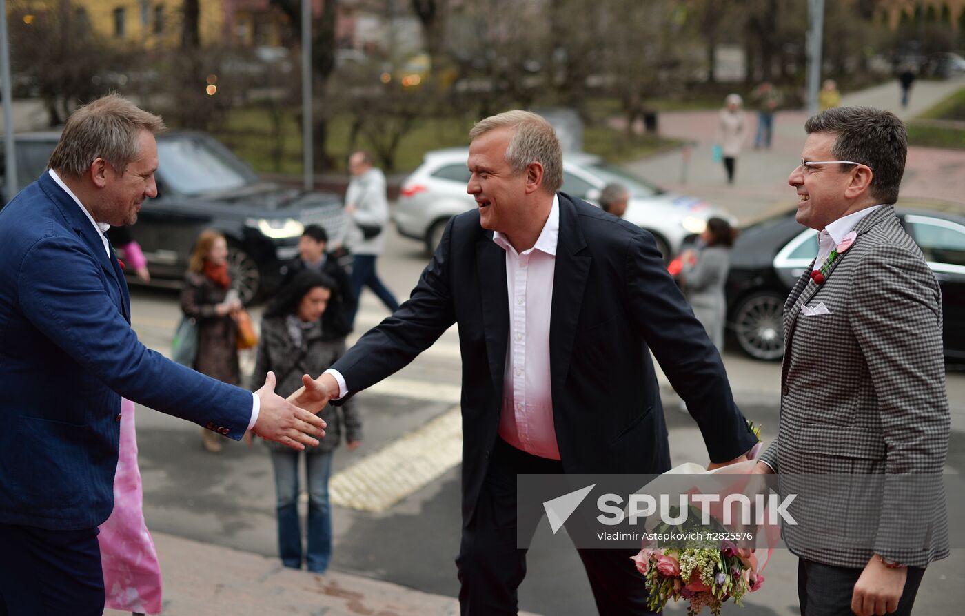 Bosco di Ciliegi Development Director Konstantin Andrikopoulos and Moscow's Minister of Culture Sergei Kapkov before the premiere of the play "People, where is this train bound for..." in the Sovremennik Theater in the Palace on the Yauza River.
