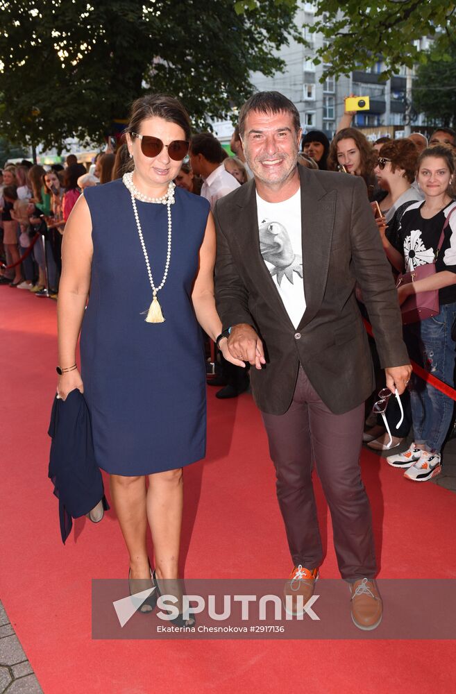 Playwright, director and actor Evgeny Grishkovets with wife Elena on a red carpet at the Russian short film festival, Koroche (Shorter), in Kaliningrad.