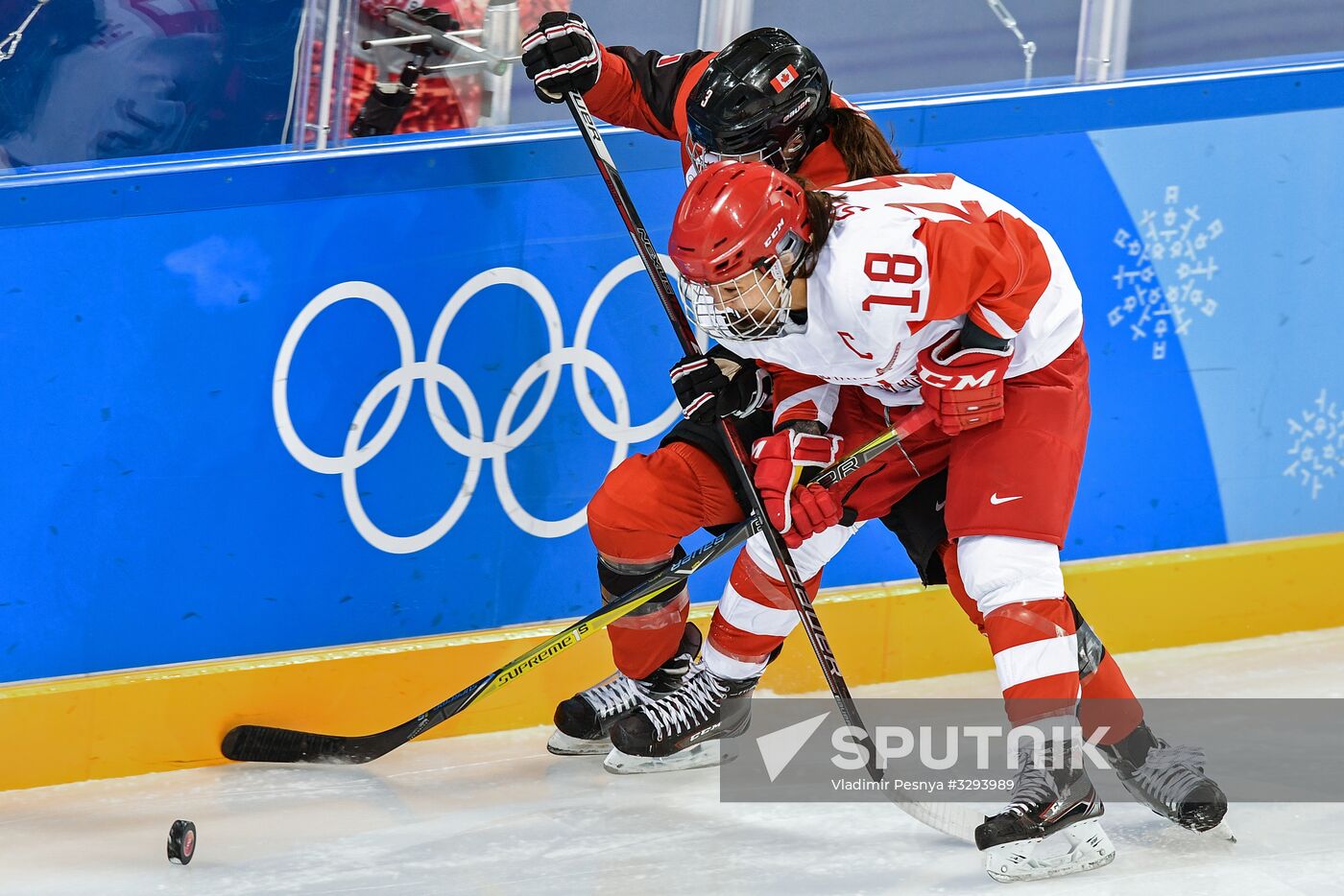Russian hockey player Olga Sosina, left, and team Canada player Jocelyne Larocque during the Canada vs. Russia match in the women’s ice hockey tournament, at the XXIII Olympic Winter Games in Pyeongchang.