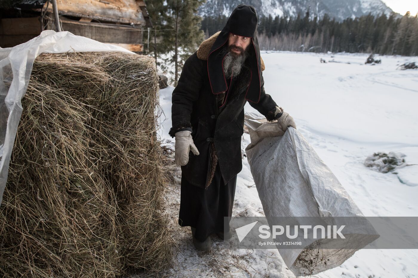 Monk Guriy, an aide to hermitess Agafia Lykova. The Lykov family of Old Believers went to the Sayan mountains taiga in the later 1930s, resided in isolation and were discovered by Soviet geologists in 1978. Agafia Lykova is currently the only survivor of the Lykovs.