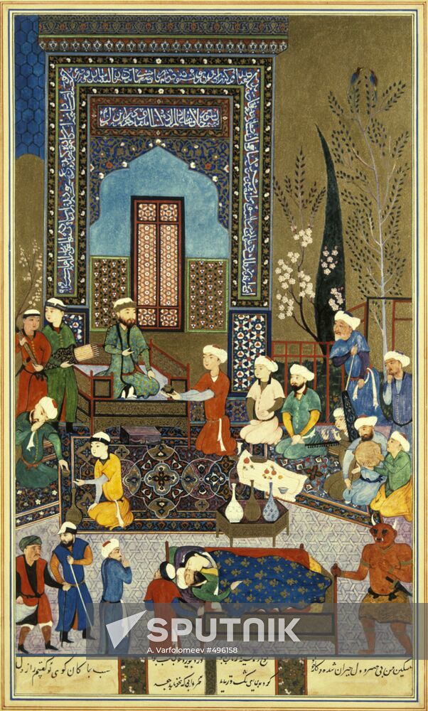 Miniature by Persian artist Kemaleddin Bekhzad's disciples, 15th-16th century. Copy by artist M.Voronskiy. Reproduction from the collection of the Institute of Oriental Studies, Uzbek Academy of Sciences.