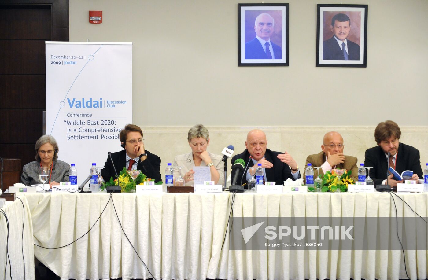 From right: Fyodor Lukyanov, "Russia in Global Politics" editor-in-chief; Sergey Karaganov, chairman of the Foreign and Defence POlicy Council presidium; Alexander Saltanov, Russian deputy foreign minister and Russian President’s Middle East Special Representative; and deputy editor-in-chief of the RIA Novosti Russian news agency Alexander Babinsky, second left, at the international conference headlined “Middle East 2020: Is the Comprehensive Settlement Possible?” in Suweima, Jordan.