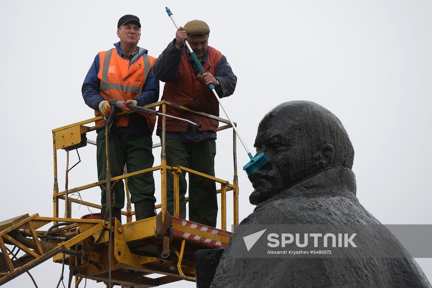 Workers wash the Lenin Monument on Lenin Square as part of the city-wide cleanup in Novosibirsk.