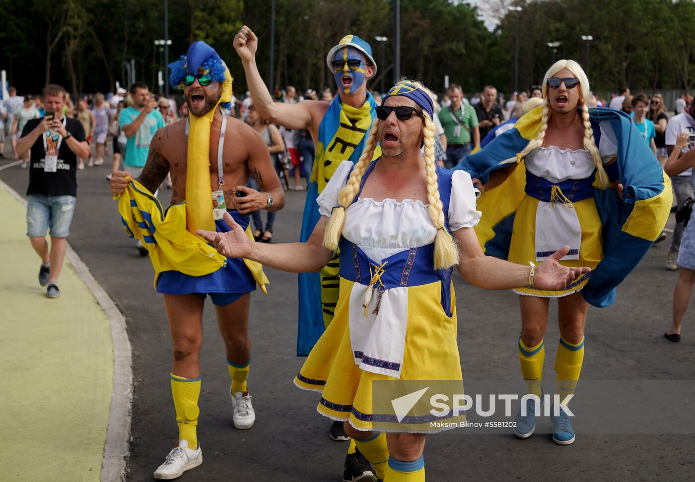 #5581202Sweden's fans cheer waiting for the start of the World Cup quarterfinal soccer match between Sweden and England, outside the Samara Arena, in Samara, Russia, July 7, 2018. Sign in or register,to downloadAdd to cartRemove from cartPackage: Russia World Cup Sweden - EnglandCategories: SportsLocation: Samara, RussiaEvent date: 07.07.2018Date published: 07.07.2018Author: Maksim BlinovCredit: SputnikSource: SputnikOriginal: DigitalMedia: JPEG, 4328x3005px, 6.4MbFIFAsoccerfootball