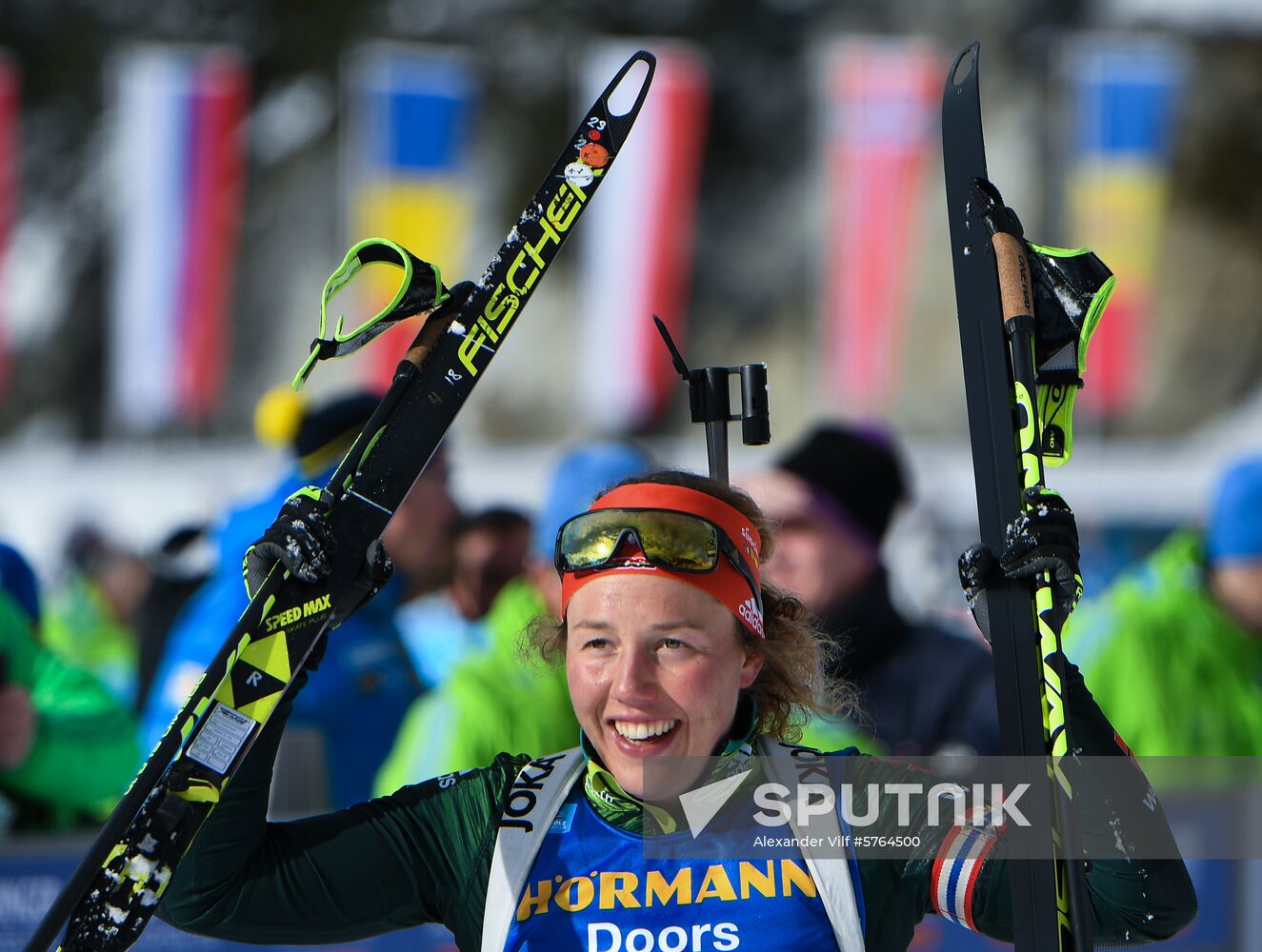 Germany's Laura Dahlmeier celebrates as she placed first at the women's mass start competition at the World Cup biathlon in Antholz-Anterselva, Italy.