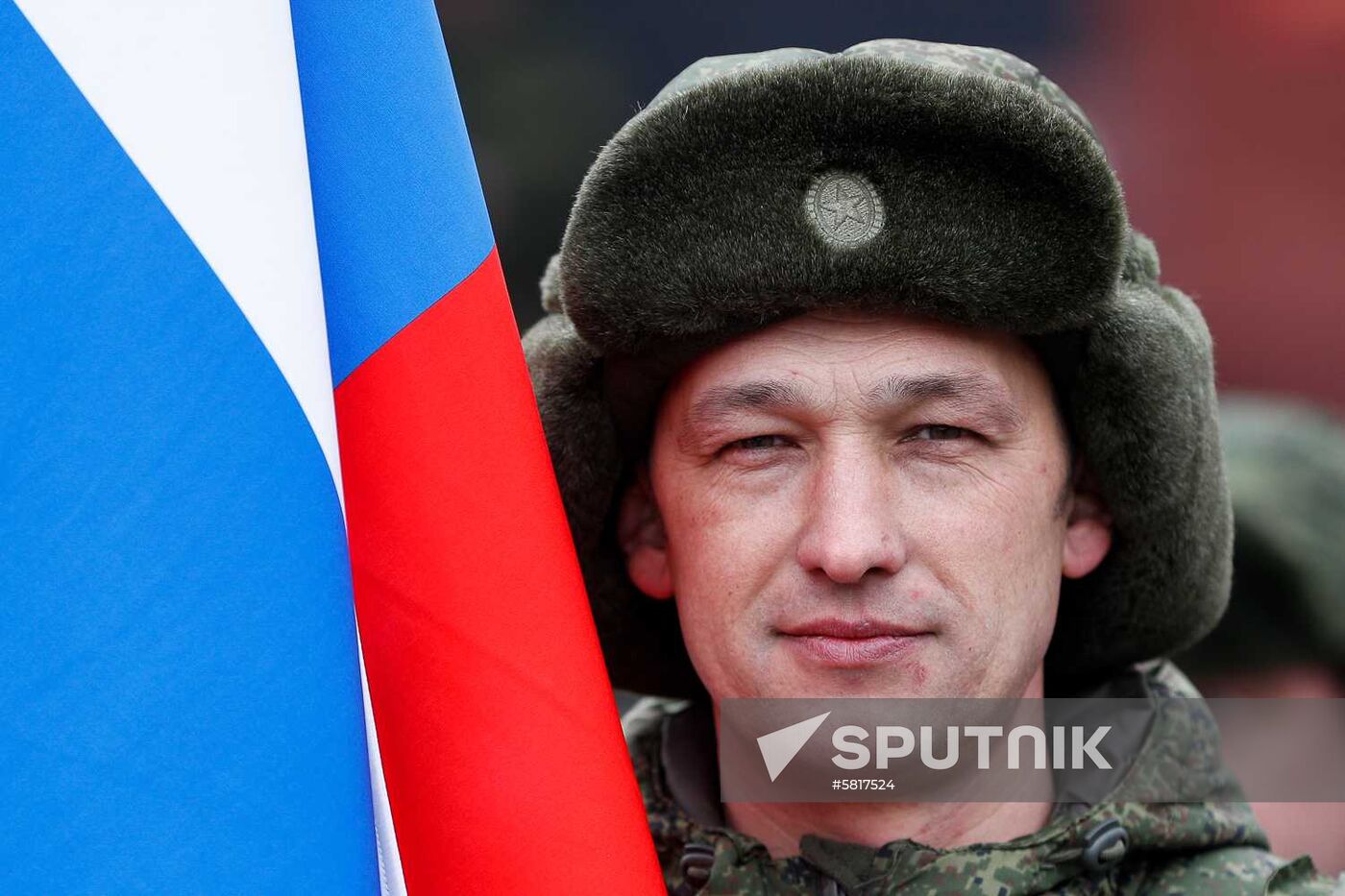 In this handout photo released by the department of information support of the Baltic region, a serviceman marches during a ceremony before a combat duty using the newest Russian S-400 Triumph missile system launchers, which have recently entered service at an air defence unit of the Baltic fleet in Kaliningrad region, Russia. Editorial use only, no archive, no commercial use.