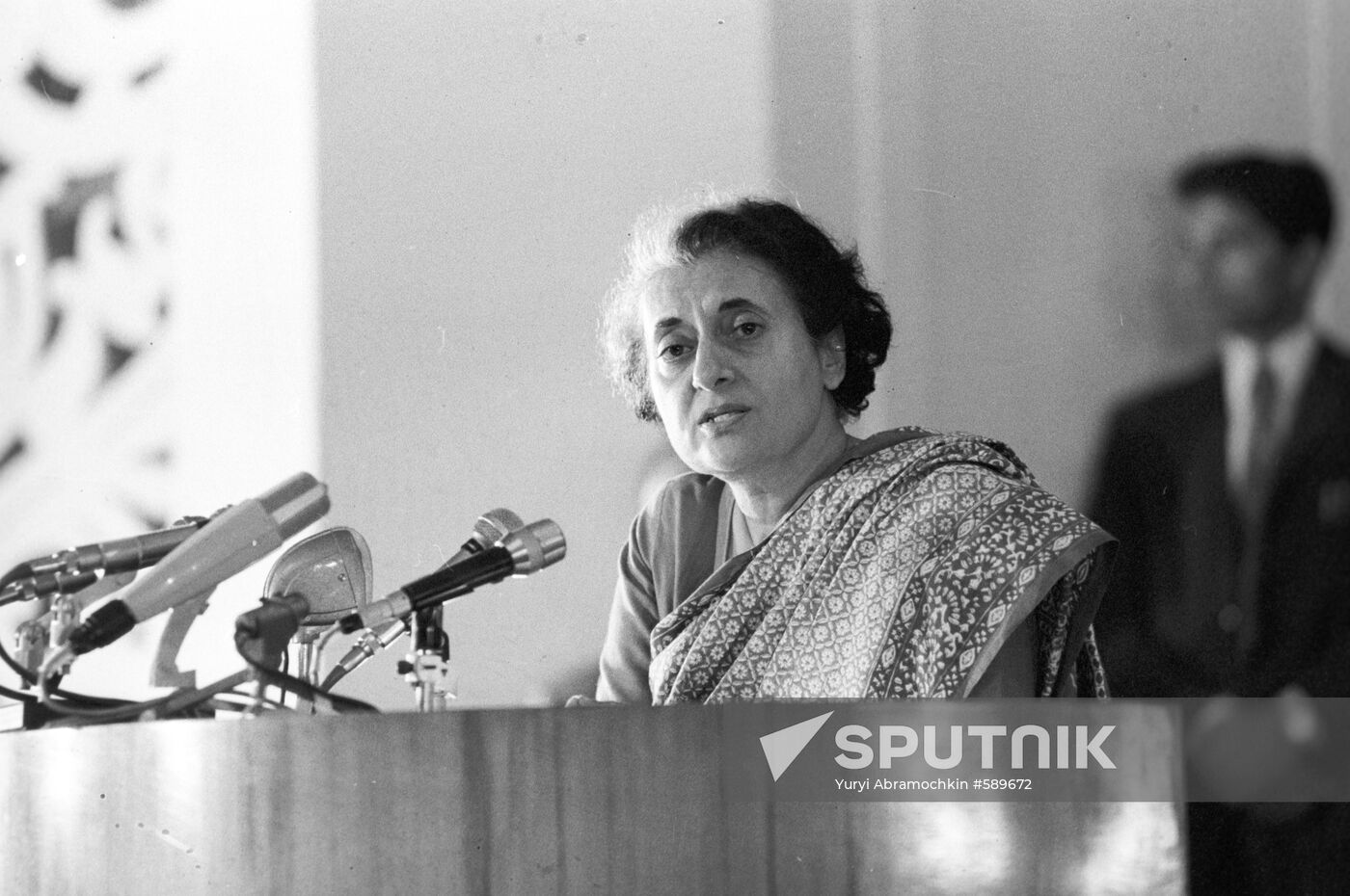 #589672Prime Minister of India Indira Gandhi addressed the participants of the General Secretary of the CPSU CC Leonid Ilyich Brezhnev's meeting with activists of the Indo-Soviet Cultural Society (ISCUS). House of Science. L.I.Brezhnev's visit to India.Sign in or register,to downloadAdd to cartRemove from cartCategories: PoliticsLocation: Delhi, IndiaEvent date: 28.11.1974Date published: 03.03.2010Author: Yuryi AbramochkinCredit: SputnikSource: SputnikOriginal: A73-19043, 35 mm filmMedia: JPEG, 5332x3543px, 4.8Mbaddressingrostrumsari