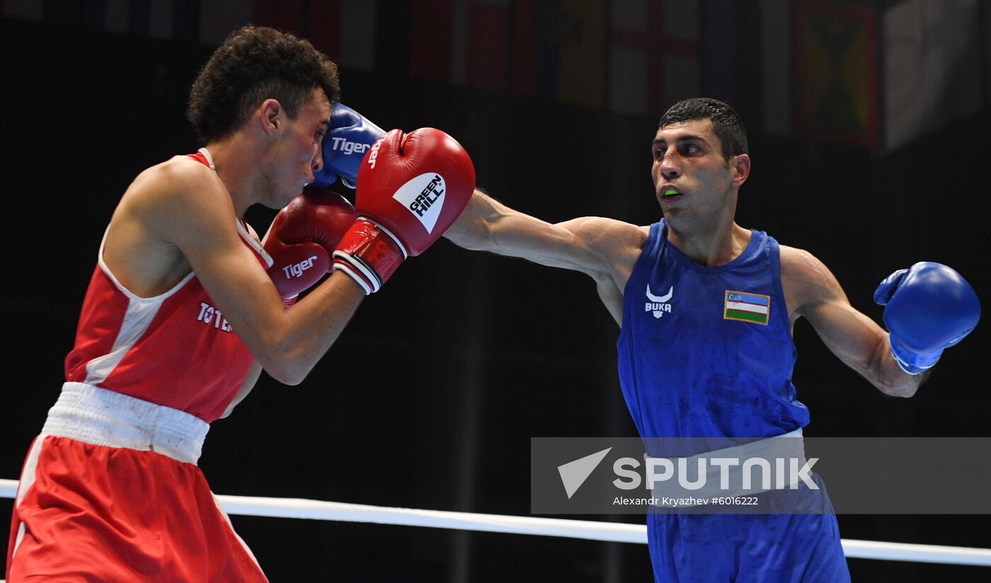 Uzbekistan's Shakhobidin Zoirov, in blue, fights France's Billal Bennama, in red, during the men's fly weight (48-52 kg) semifinals bout at the 20th World Boxing Championship, in Yekaterinburg, Russia.