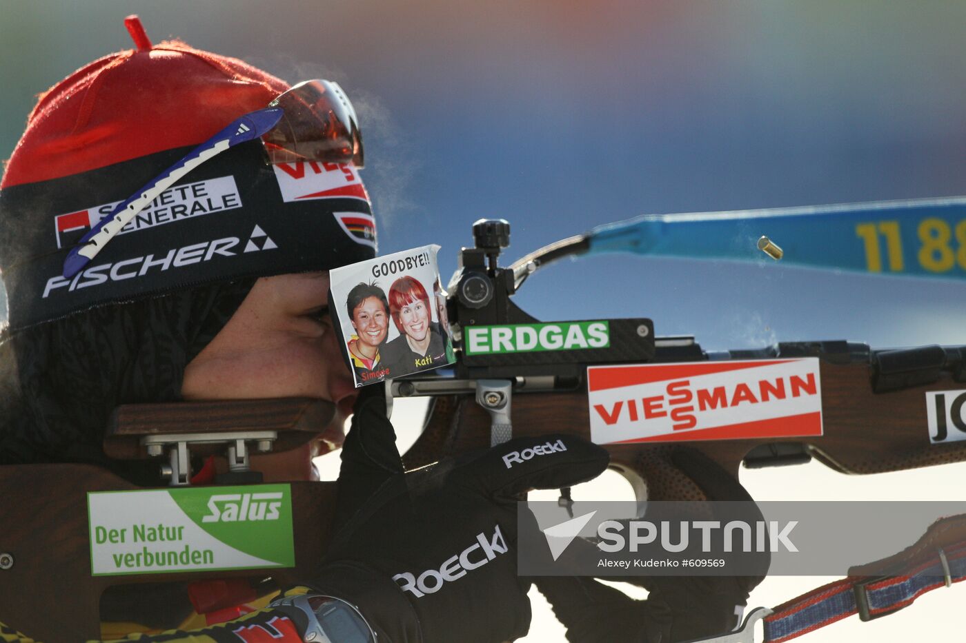 Germany's Magdalena Neuner shooting at the lane to grab gold at women's 12.5 km mass start race in Khanty-Mansiysk winning biathlon World Cup overall title in the Biathlon World Cup 2009/2010.