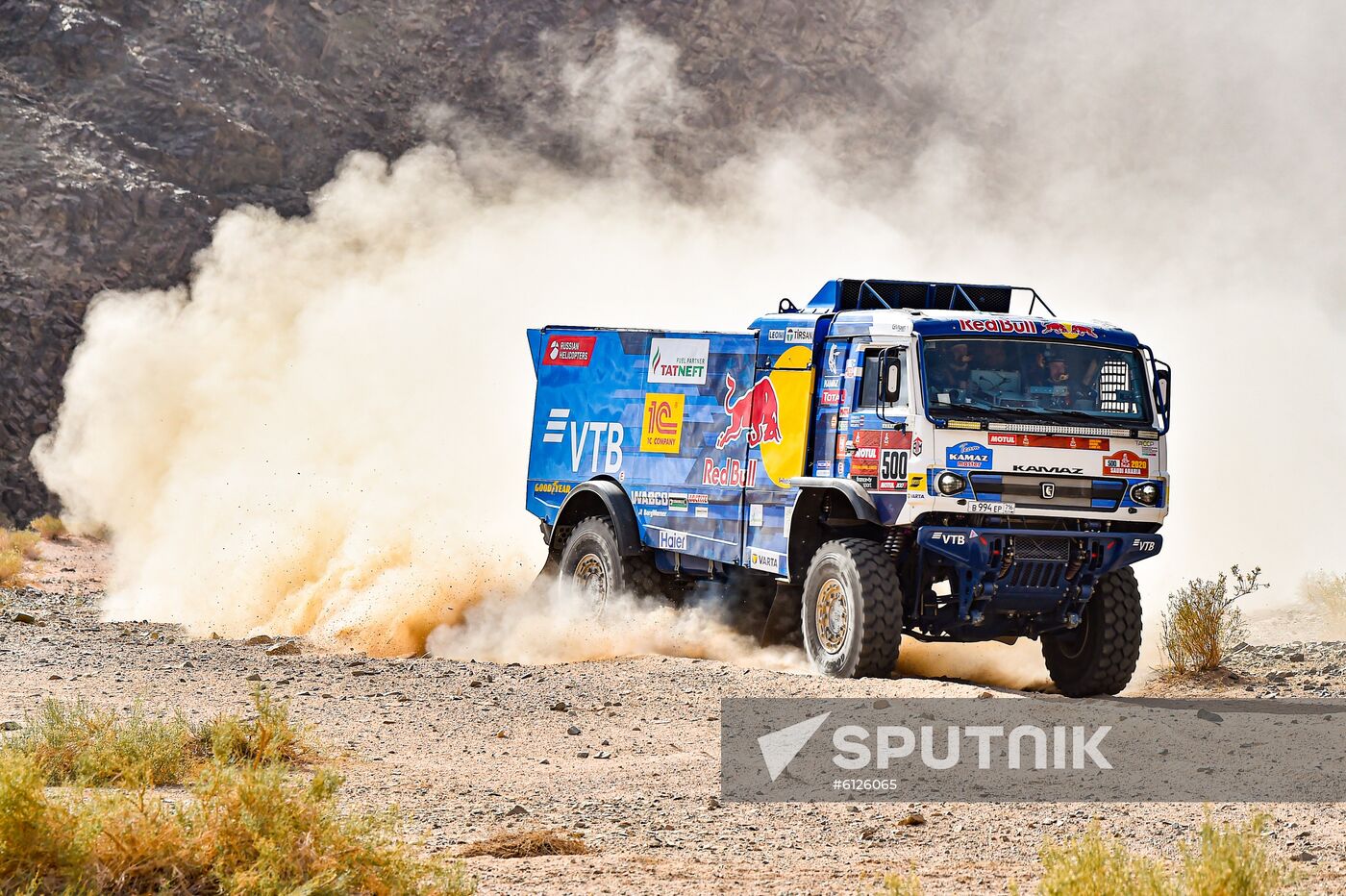 In this handout photo released by kamazmaster.ru, KAMAZ-Master's driver Eduard Nikolaev, mechaniс Vladimir Rybakov and co-driver Evgenii Iakovlev steer their truck during the fourth stage of the Dakar rally from Neom to Al Ula, in Saudi Arabia. Editorial use only, no archive, no commercial use.
