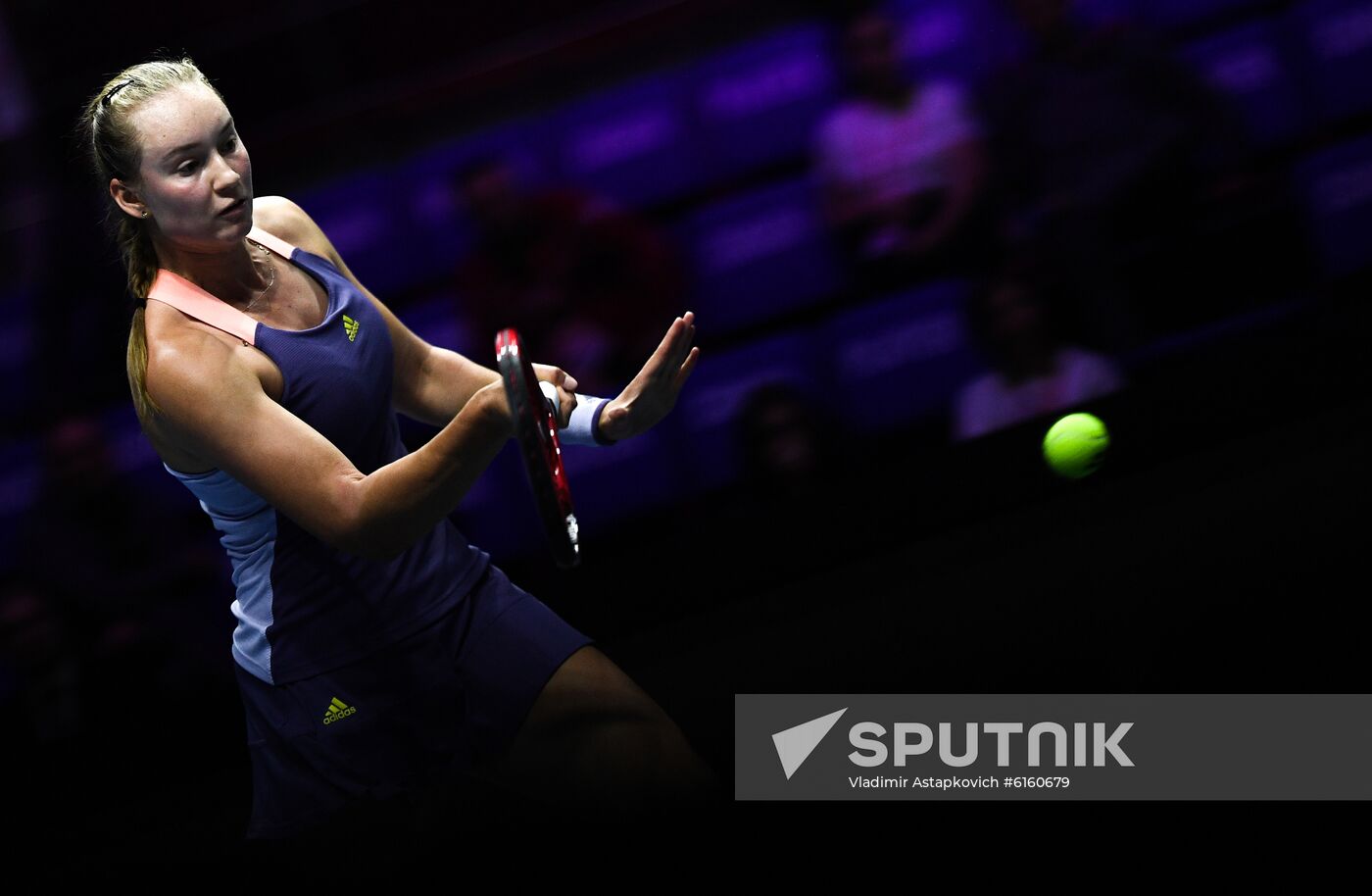Kazakhstan's Elena Rybakina returns a ball during a women's singles match against Czech Republic's Katerina Siniakova at the St. Petersburg Ladies Trophy 2020 tennis tournament in St.Petersburg, Russia.