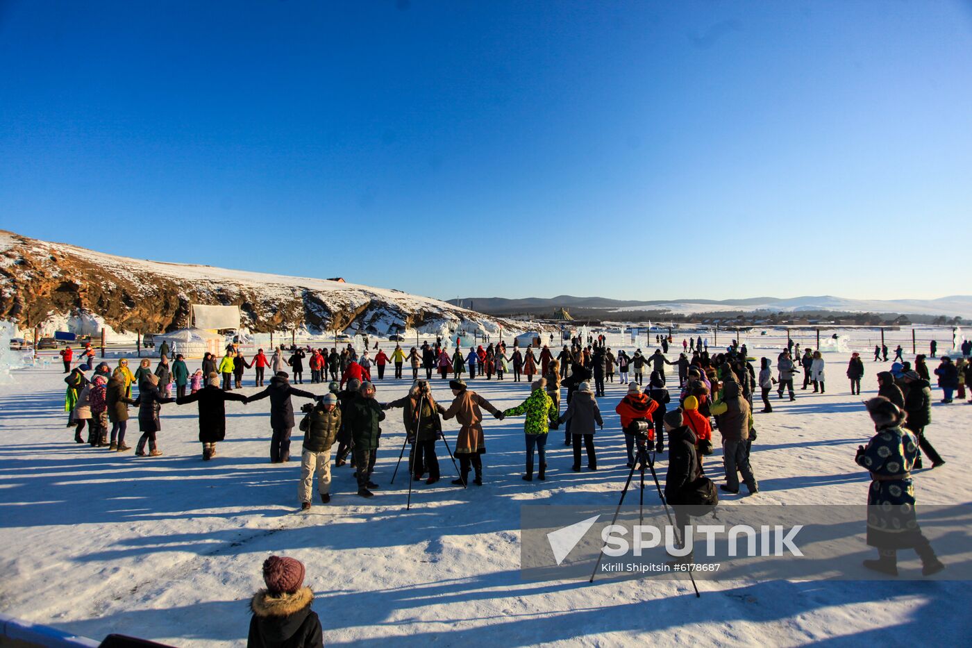 People sing and dance in a ring during an ice sculpture contest at the Olkhon Ice Fest on Lake Baikal, Irkutsk region, Russia.
