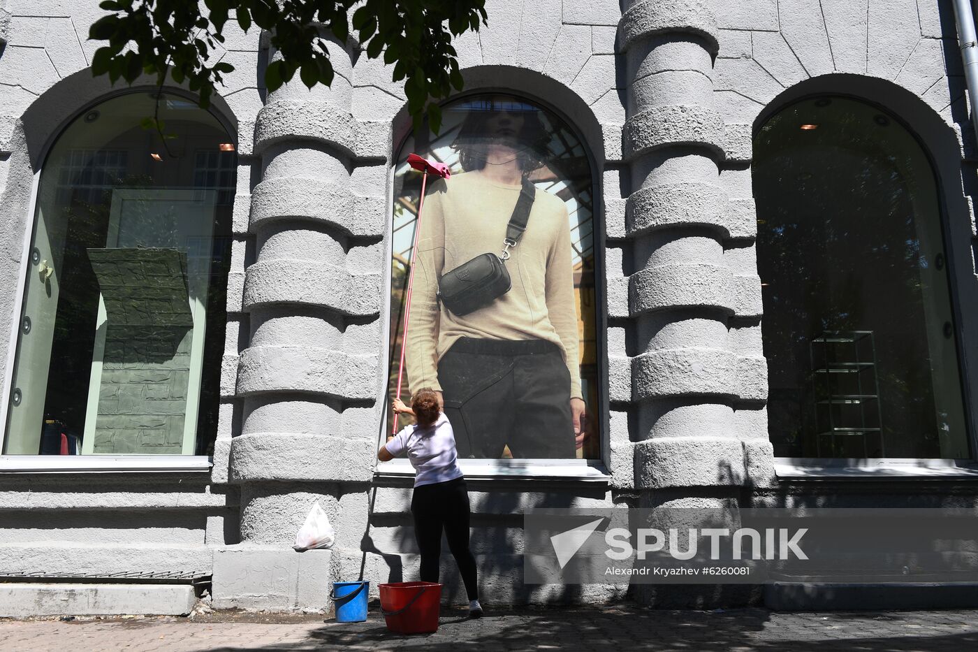 An employee washes a window of a clothing store that reopened following lockdown restrictions amid the coronavirus disease outbreak in Novosibirsk, Russia.