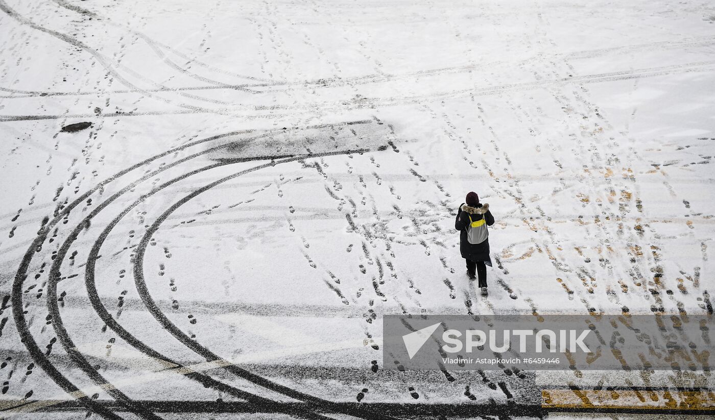A resident walks in a street during a snowfall, in Moscow, Russia.