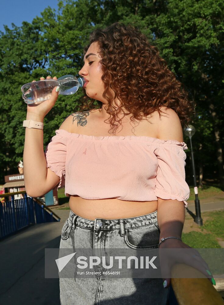 A young woman enjoys a beverage on a hot spring day, in Samara, Russia.