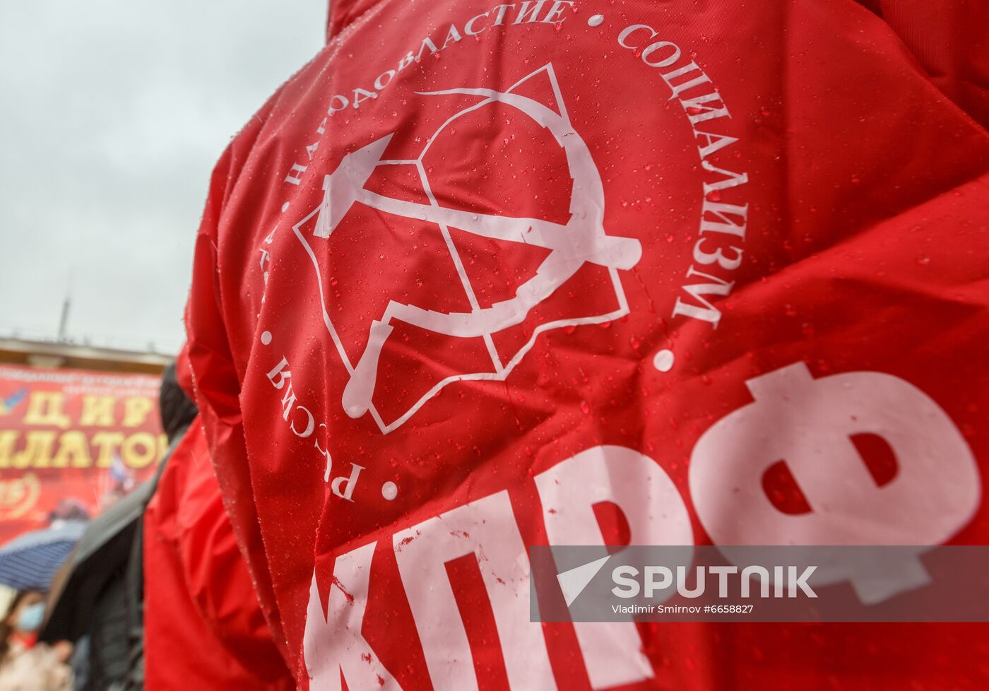 A flag of Russian Communist Party (KPRF) waves during a rally against parliamentary elections results, on the Labor Square, in Irkutsk, Russia. Legislative elections were held in Russia from 17 to 19 September 2021.