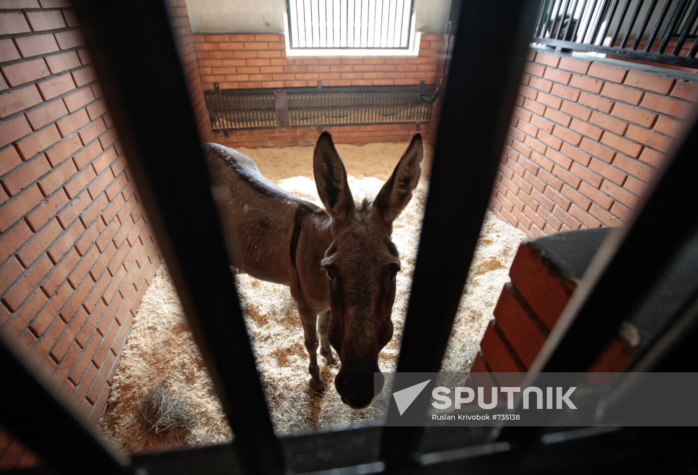 Donkey Anapka at the Kremlin equestrian school in Krasnogorsky district of the Moscow Region. The animal is undergoing rehabilitation after the owners of water attractions on a central beach in the village of Golubitskaya, Temryuksky district of the Krasnodar Territory, lifted it up on a parachute.