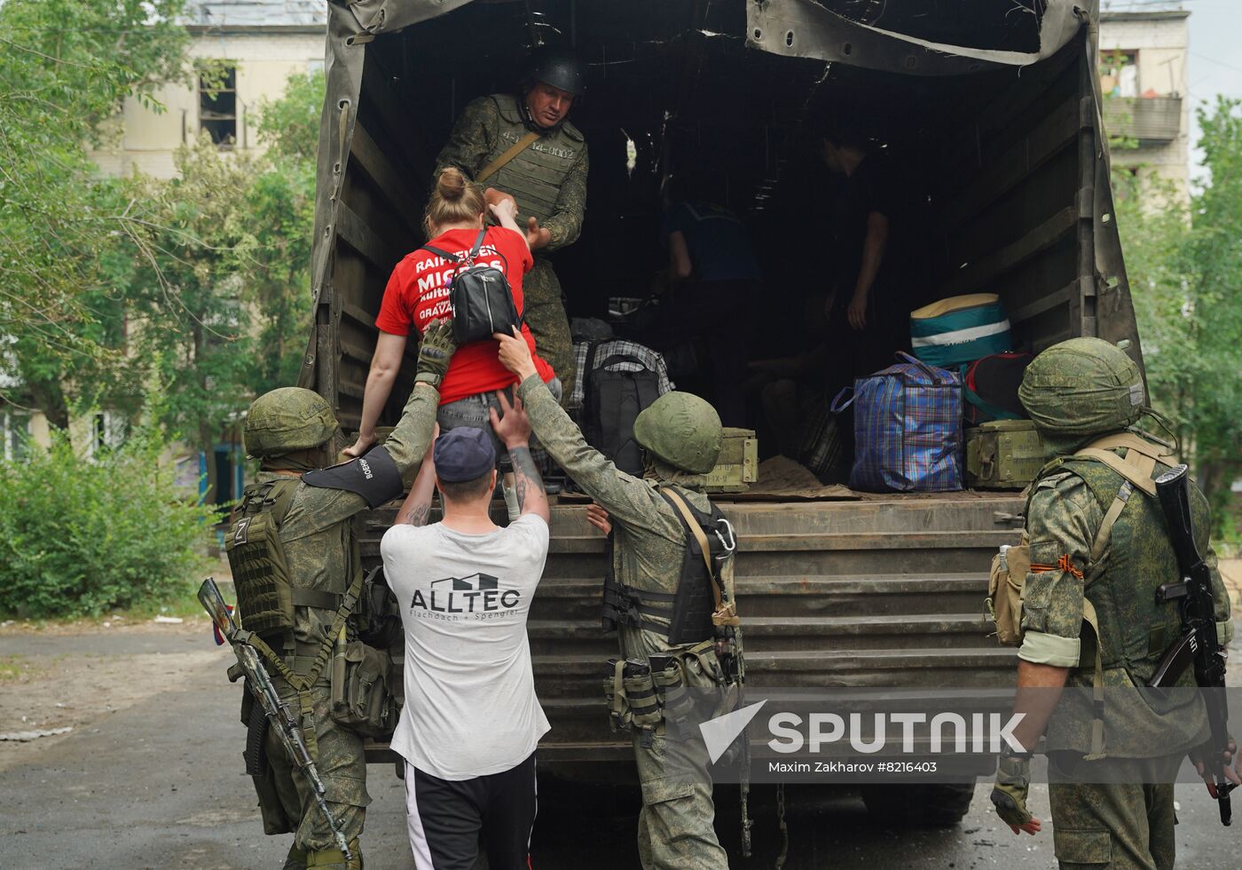 Servicemen of Luhansk People's Republic's militia evacuate local residents in the course of Russia's military operation in Ukraine, in Severodonetsk, Luhansk People's Republic.