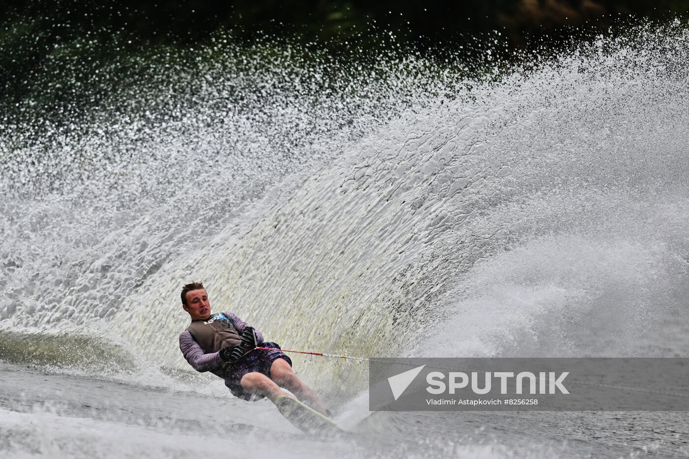 An athlete competes in the men's slalom event during the Russian Water Skiing Championship at the Ruzino reservoir in Moscow region, Russia.