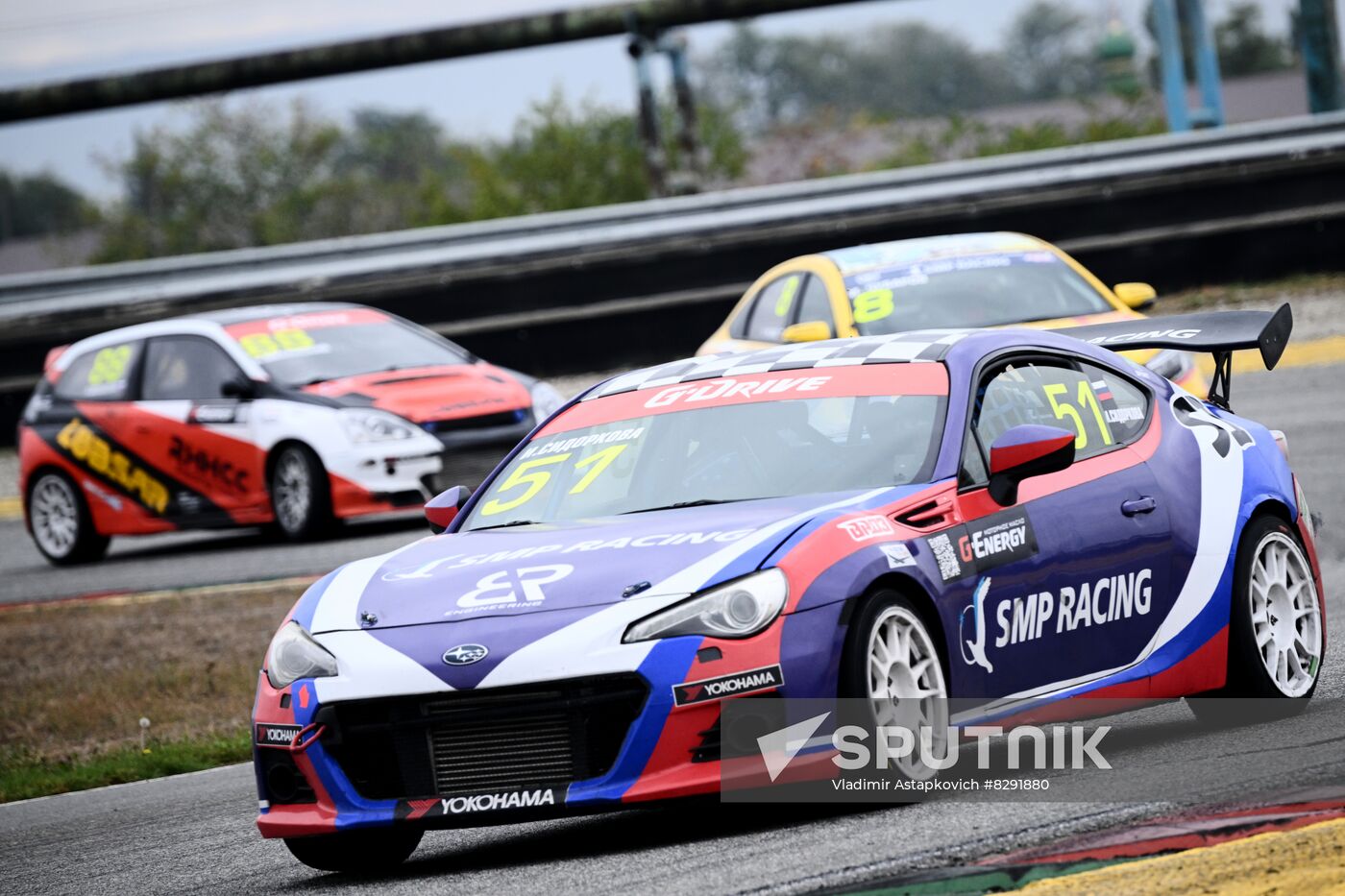 Irina Sidorkova steers her car during a "Touring. Super-production" race of the 6th G-Drive Russian Circuit Racing Series at the Fort Grozny autodrom in Grozny, Russia's Chechen Republic.