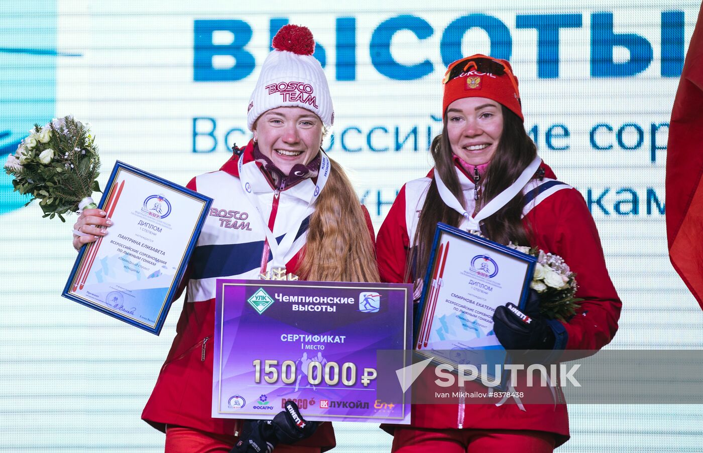 Gold medalists Elizaveta Pantrina, left, and Ekaterina Smirnova celebrate on the podium during the awarding ceremony for the women's team's sprint final at the All-Russian cross-country skiing competition "Championship Heights" in Malinovka, Arkhangelsk region, Russia.