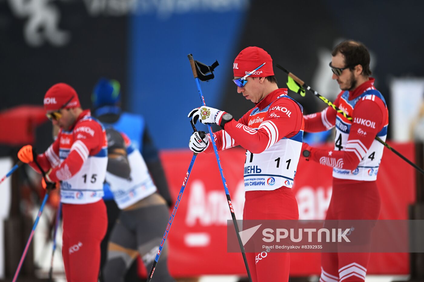 Andrey Sobakarev, centre, prepares for a men's 1,4 km sprint classic semifinal of the Russian Cross-Country Skiing Championship outside Tyumen, Russia.