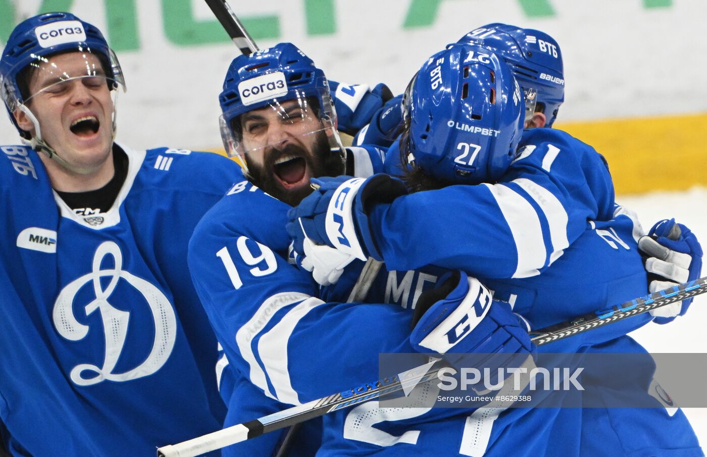 Dynamo Msk's players celebrate the team's goal during the Kontinental Hockey League ice hockey match between Dynamo Moscow and CSKA Moscow, in Moscow, Russia.