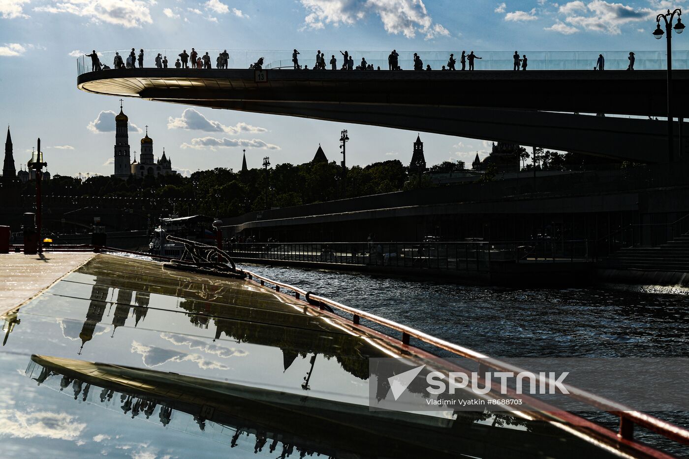 People stand on a pedestrian bridge over the Moskva River at Zaryadye Park in Moscow, Russia.