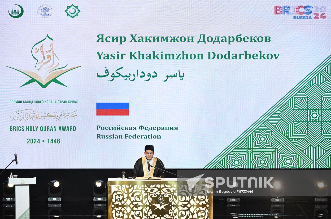 Hafiz Yasir Dodarbekov of Russia speaks during the BRICS Holy Quran Award in Kazan, Republic of Tatarstan, Russia. From July 24 to 26, 2024, the strongest Quran reciters from BRICS member states, the Arab-Muslim world, Africa, and the CIS will compete in the category of "Tilawah" (skillful recitation of the Holy Quran).