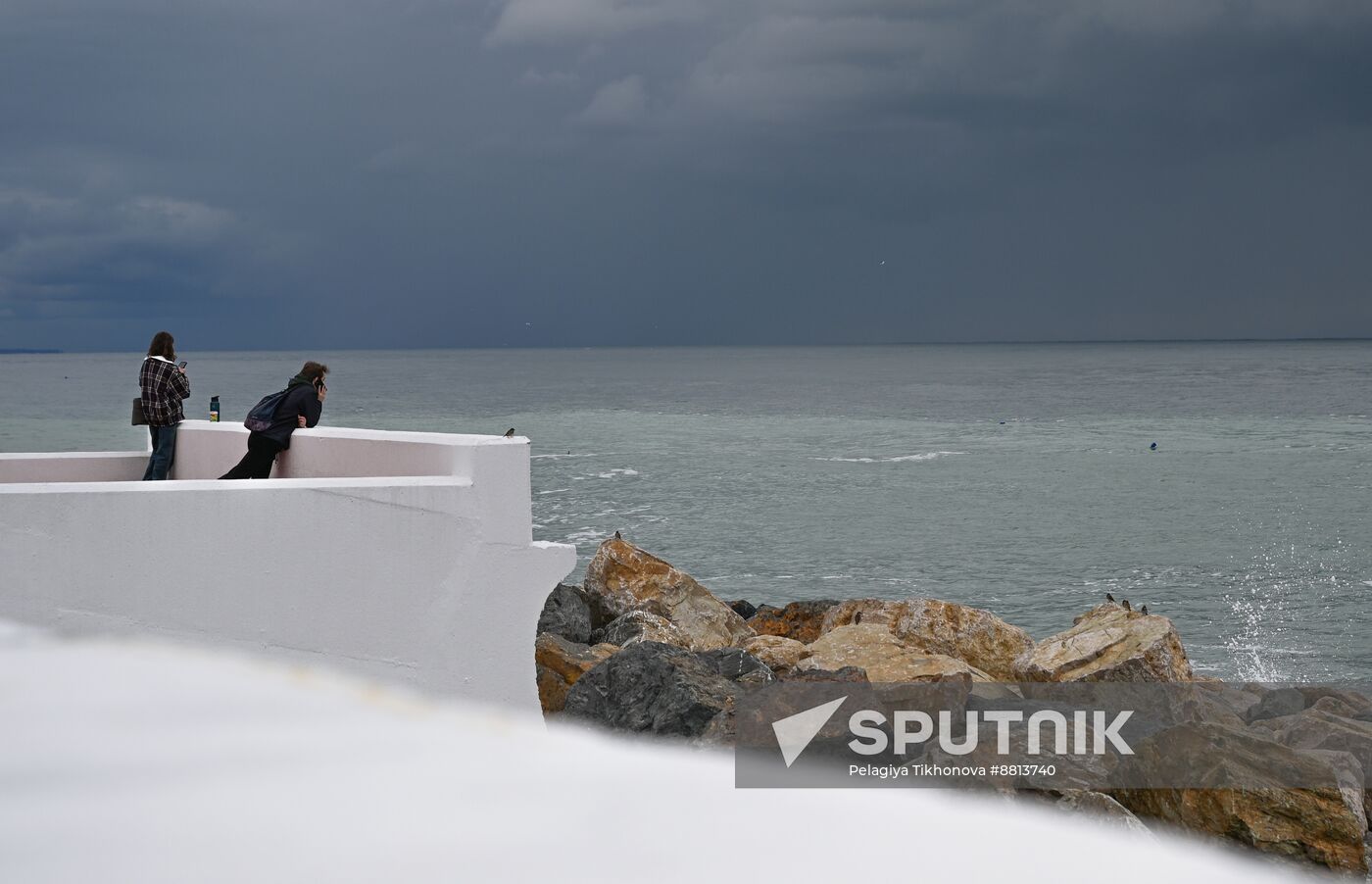 People rest on the shore by the Black Sea at the Sirius federal territory, Krasnodar region, Russia.