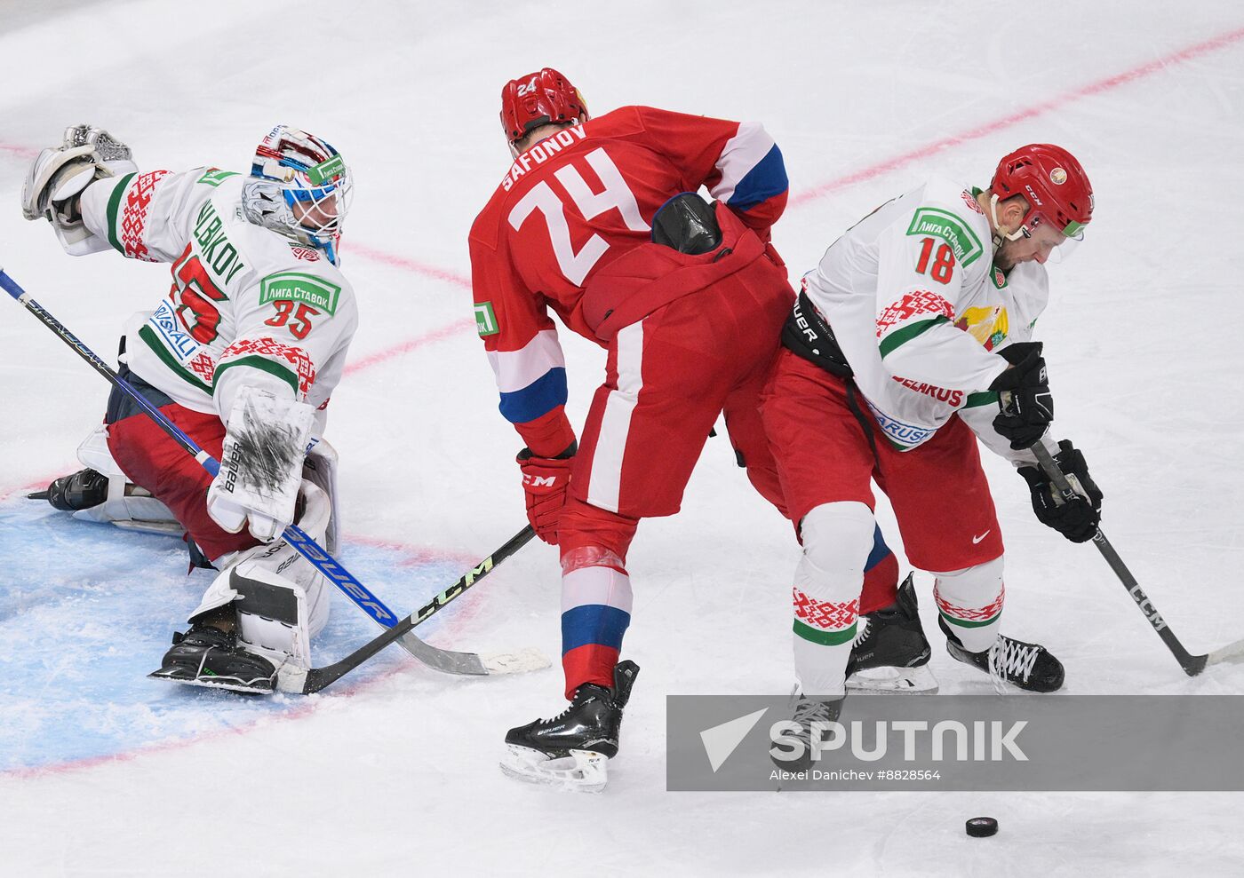 Belarus' Kristian Khenkel, right, and Russia 25's Ilya Safonov vie for the puck in front of Belarus' goaltender Ivan Kulbakov during the Channel One Cup ice hockey match between Russia 25 and Belarus at the SKA Arena in St. Petersburg, Russia.