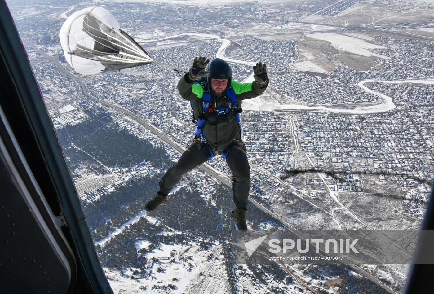 A firefighter of the Aerial Forest Protection Service jumps with a parachute during airborne landing drills at the Kashtak airfield in Chita, Russia.
