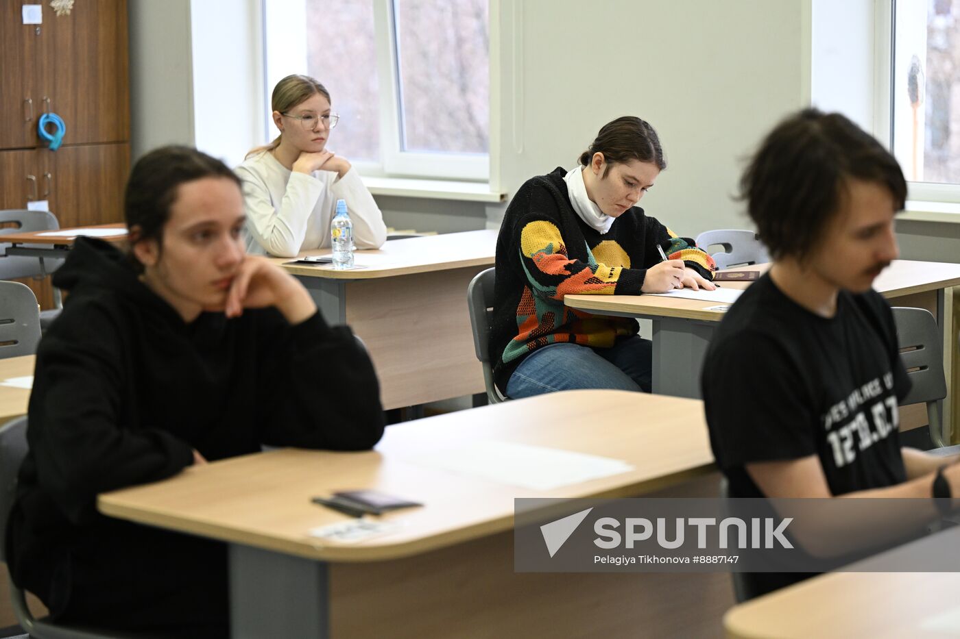 #8887147Senior pupils sit in a classroom waiting to pass a Unified State Exam in Russian language at the secondary school No 199 in Moscow, Russia.Sign in or register,to downloadAdd to cartRemove from cartPackage: Russia Education Unified State ExamCategories: EducationLocation: Moscow, RussiaEvent date: 25.03.2025Date published: 25.03.2025Author: Pelagiya TikhonovaCredit: SputnikSource: SputnikOriginal: DigitalMedia: JPEG, 8256x5504px, 18.9MbJob-ID: 249c7ef5efdc12ec