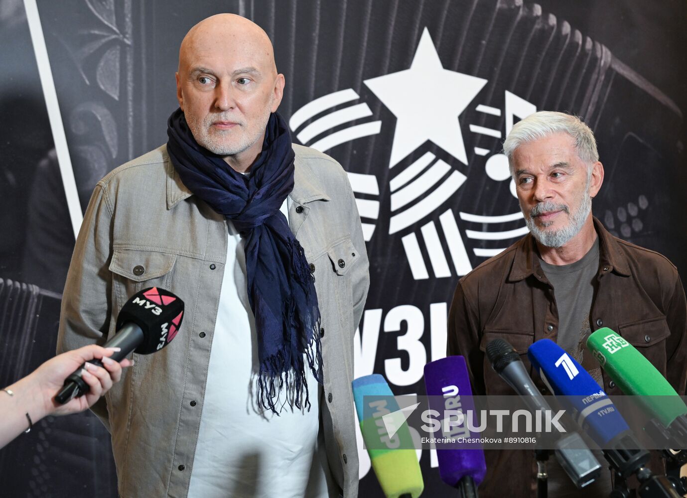 Music producer Igor Matviyenko, left, and singer Oleg Gazmanov at the presentation of the Music of Victory project in Moscow.