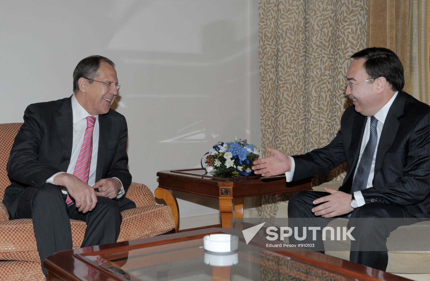 From left: Russian and Kzakhstan's Foreign Ministers Sergey Lavrov and Yerzhan Kazykhanov talking during their meeting in Almaty.