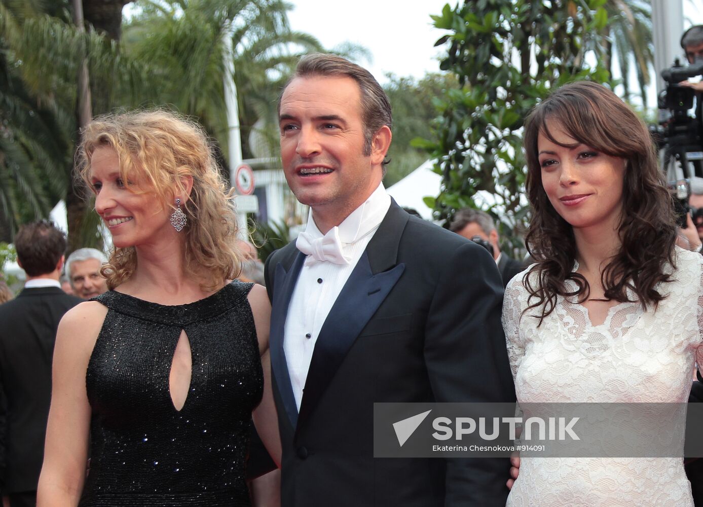 From left: actors Alexandra Lamy, Jean Dujardin, and Bérénice Bejo on the red carpet at the premiere of the film that closes the 64th Cannes film festival.