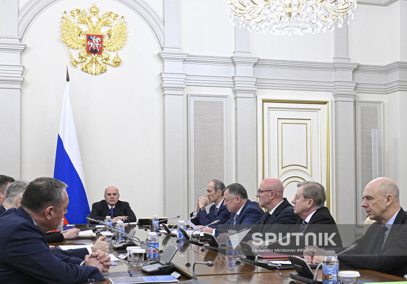 Russian Prime Minister Mikhail Mishustin chairs a meeting with his deputies, as Deputy Prime Minister - Chief of the Government Staff Dmitry Grigorenko, Deputy Prime Ministers Marat Khusnullin, Dmitry Chernyshenko and Vitaly Saveliev, and Finance Minister Anton Siluanov sit nearby, in Moscow, Russia.