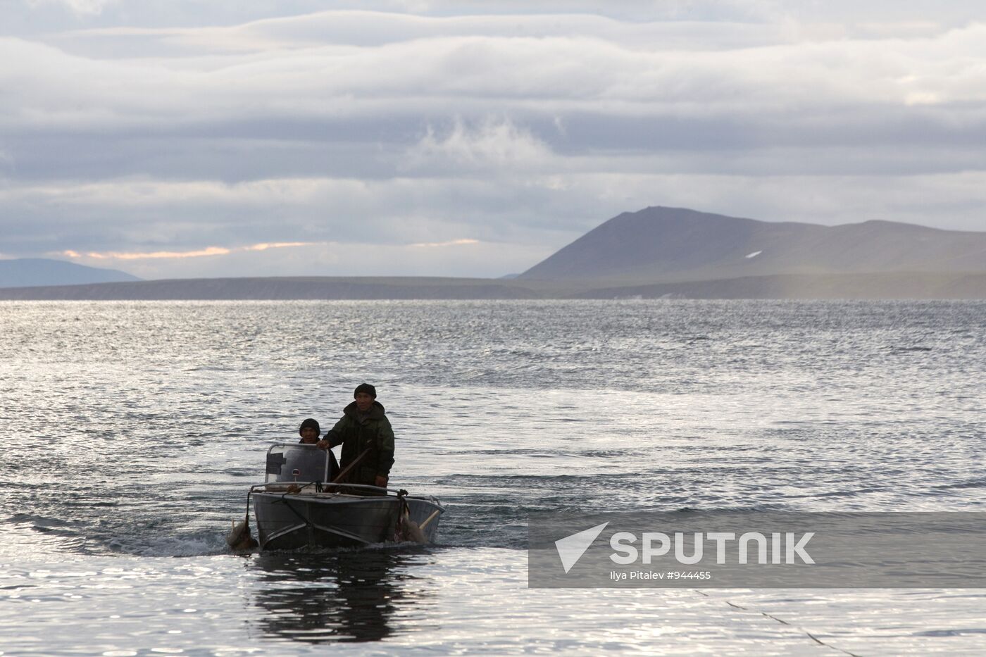 Fishermen riding on a boat near a hunters' base, Akkani cape.