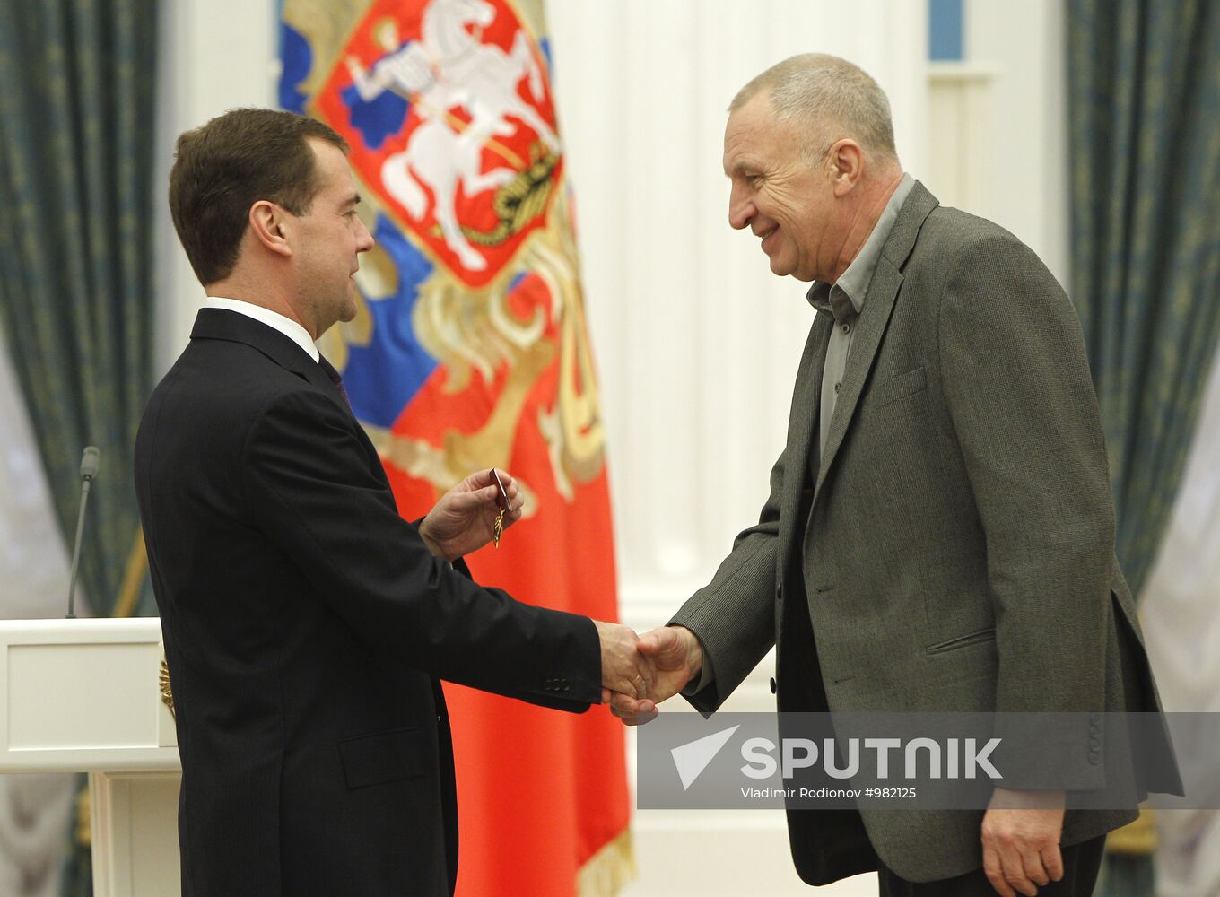 October 31, 2011. President Dmitry Medvedev, left, presents the Order of Service to the Fatherland, 4th class, to film director Andrei Smirnov at the Catherine's Hall, Kremlin.