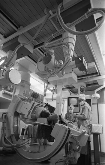 The All-Union Cardiology Research Center of the USSR Academy of Medical Sciences (currently National Medical Research Center Of Cardiology of the Russian Ministry of Healthcare). A coronary angiography device.03.07.1982#6712148
