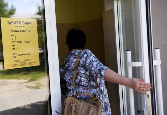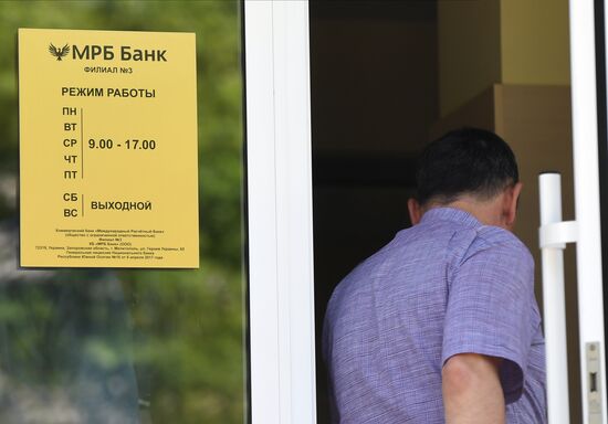 Acting Head of the Military-civil Administration of the city of Energodar, Andrey Shevchik, visits to the MRB Bank in Melitopol, Ukraine.17.05.2022#8193477