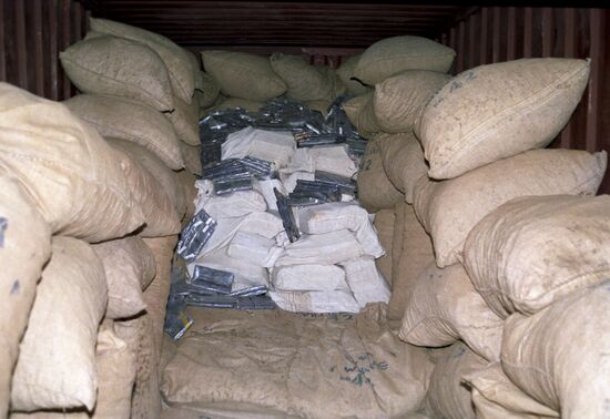 Fighting the international drug mafia. Customs officers impound a container with licorice root bags used to transport drugs. Hashish briquets, confiscated from the container, have been specially marked for tracking the drug batch.08.03.1987#6590914