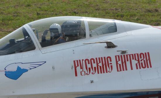 Members of the Russian aerobatic team Russkiye Vityazi (Russian Knights) performing the preflight acquisition on the territory of Kubinka airfield.06.08.2013#2259303